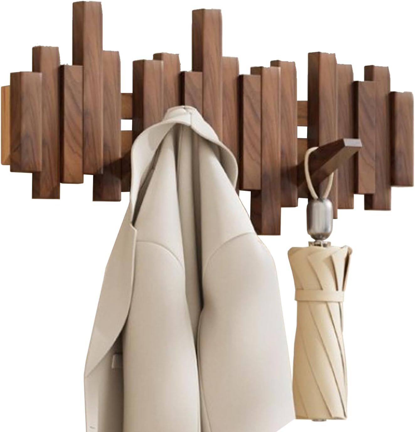 Natural Wooden Coat Rack Wall Mount.Material: using premium natural solid beech/ walnut.- Beech: a strong and refined wood with soft and warm tones.- Walnut: high-grade wood with rich irregular grain, unique texture.Special Design: inspired by piano keys, it s a modern piece of art by a first glance until you notice that some of the sticks flipable by pulling the hooks. When its hook is turned back, it will create a seamless outline.Note: The product is made of high-quality solid wood, and due to the different humidity and temperature in each region, slight deformation may occasionally occur.